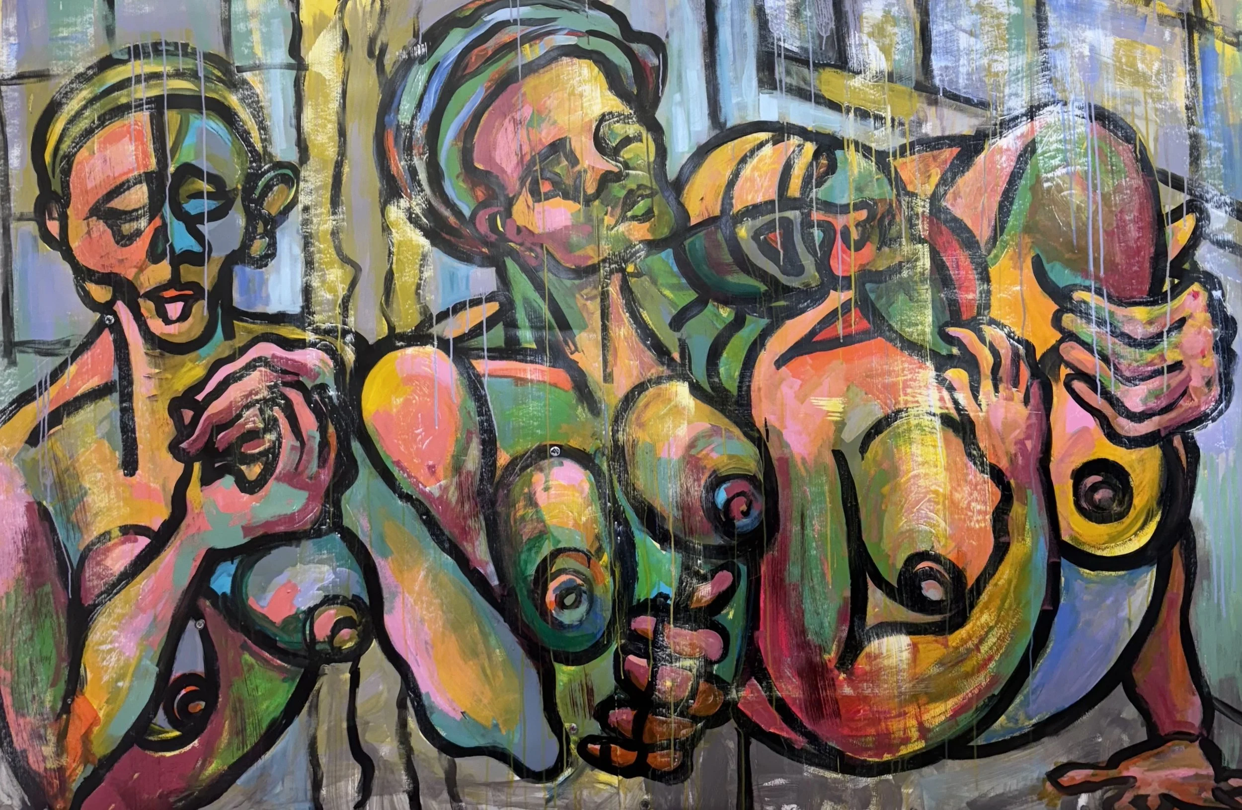 Hug Me, Don't Hug Me, I'll Do It Myself, mixed media on paper, 93" x 84"